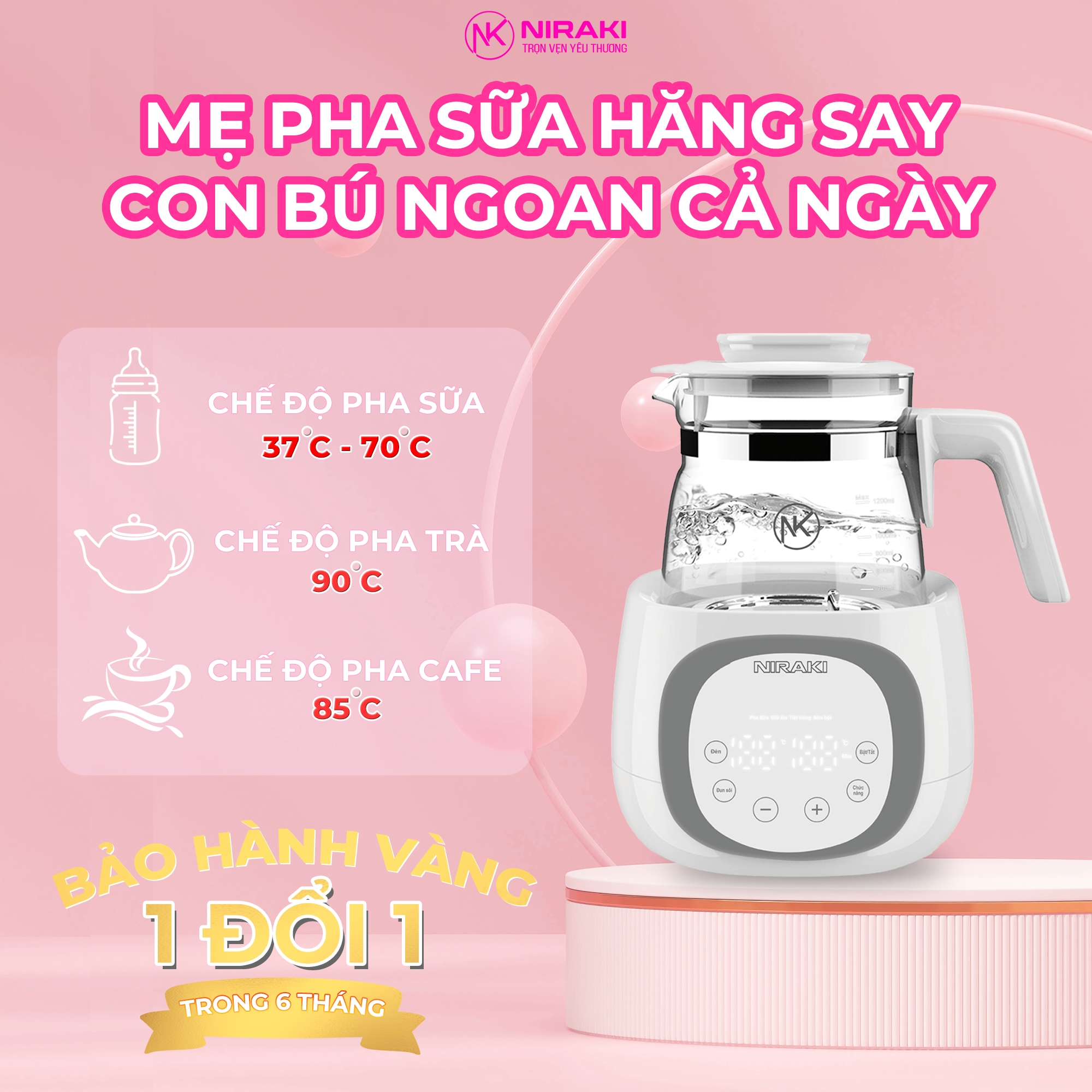 Việc duy trì nhiệt độ nước phù hợp để pha sữa hoặc đồ uống cho bé yêu luôn là mối quan tâm hàng đầu của các mẹ. Bình Đun Giữ Nhiệt Niraki sẽ là trợ thủ đắc lực của mẹ trong vấn đề này. Ngoài ra, bình đun giữ nhiệt Niraki còn tích hợp nhiều công dụng khác như: đun nước pha trà, đun nước uống trực tiếp,... Với tính đa năng, đây hẳn là sự lựa chọn tuyệt vời giúp mẹ hoàn thành tốt vai trò mẹ sữa và chăm sóc sức khỏe gia đình.