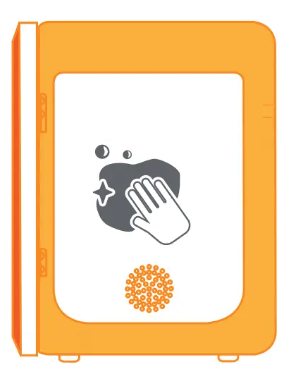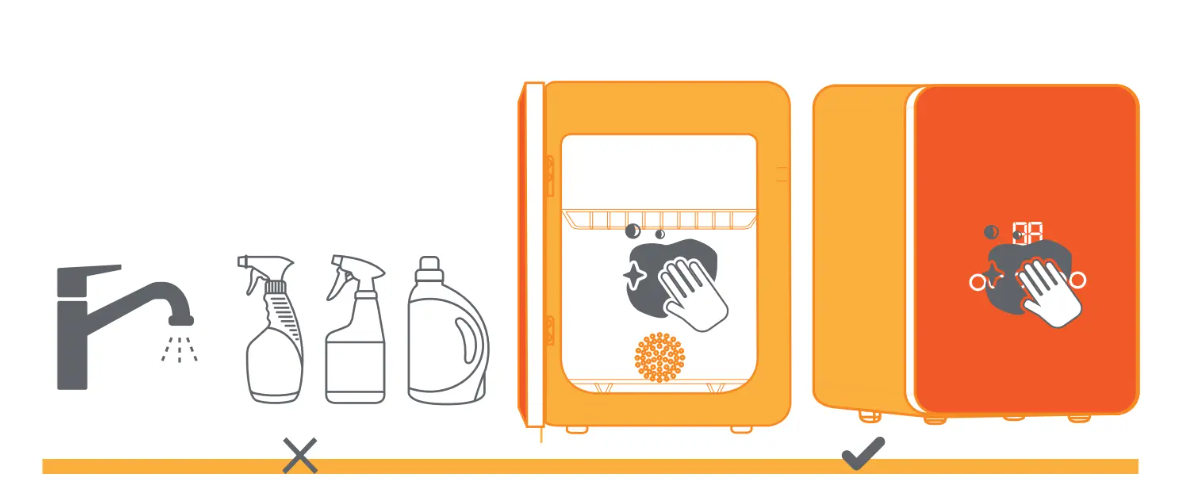 Thiết bị không bao giờ được tiếp xúc với bất kỳ chất tẩy rửa nào ngoài nước. Nó sẽ gây ra thiệt hại không thể lấy lại được và làm hỏng bề mặt bên trong của máy tiệt trùng hoặc lớp phủ chống tia cực tím (UV) trên kính.
