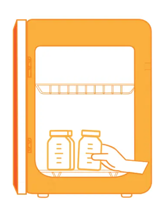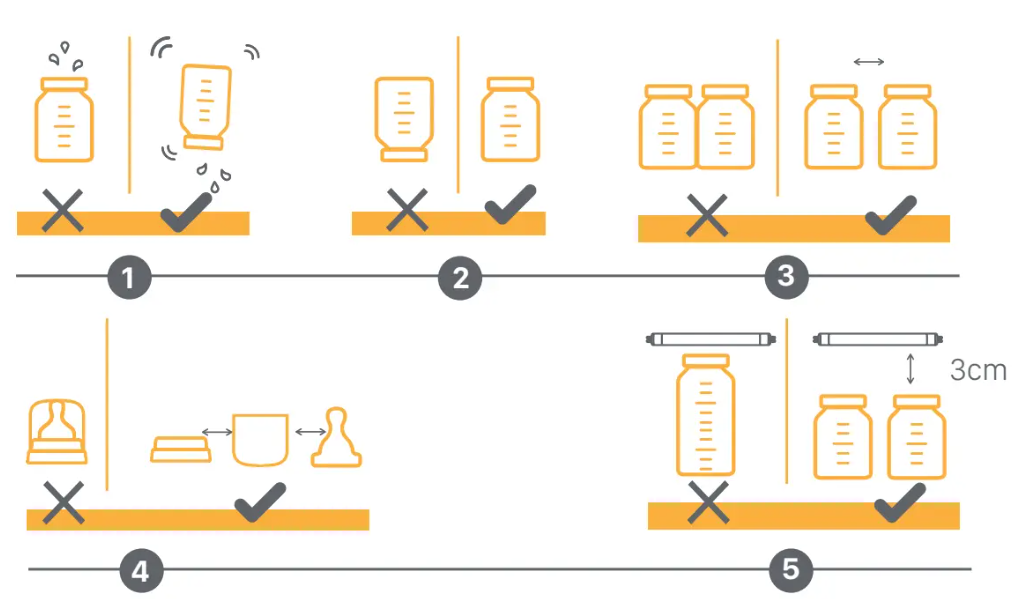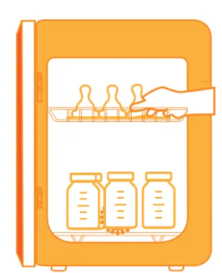 Đặt tất cả các bình sữa ở trên kệ trên miệng hướng lên trên và tất cả núm vú và các phụ kiện nhỏ trên giá bên. Hãy sắp xếp rời nhau ra. KHÔNG xếp chồng các đồ vật, tất cả các vật dụng phải được tiếp xúc với tia cực tím (UV) để đạt được hiệu quả tiệt trùng hoàn toàn.