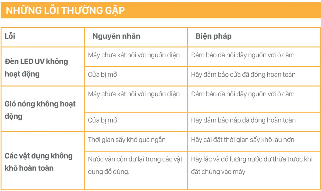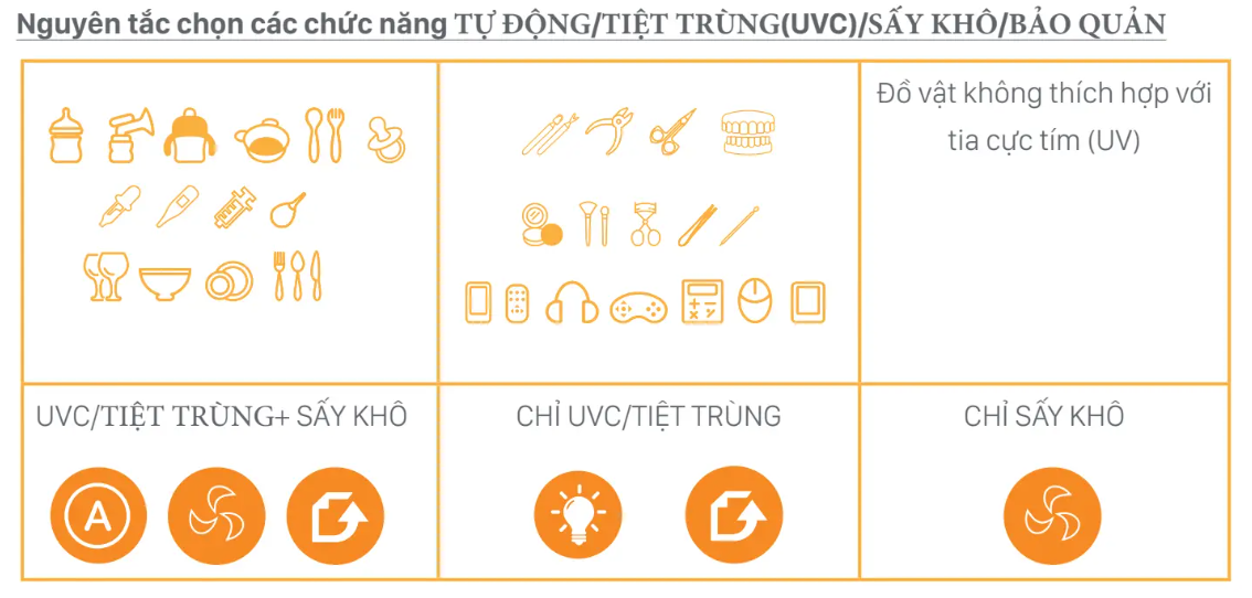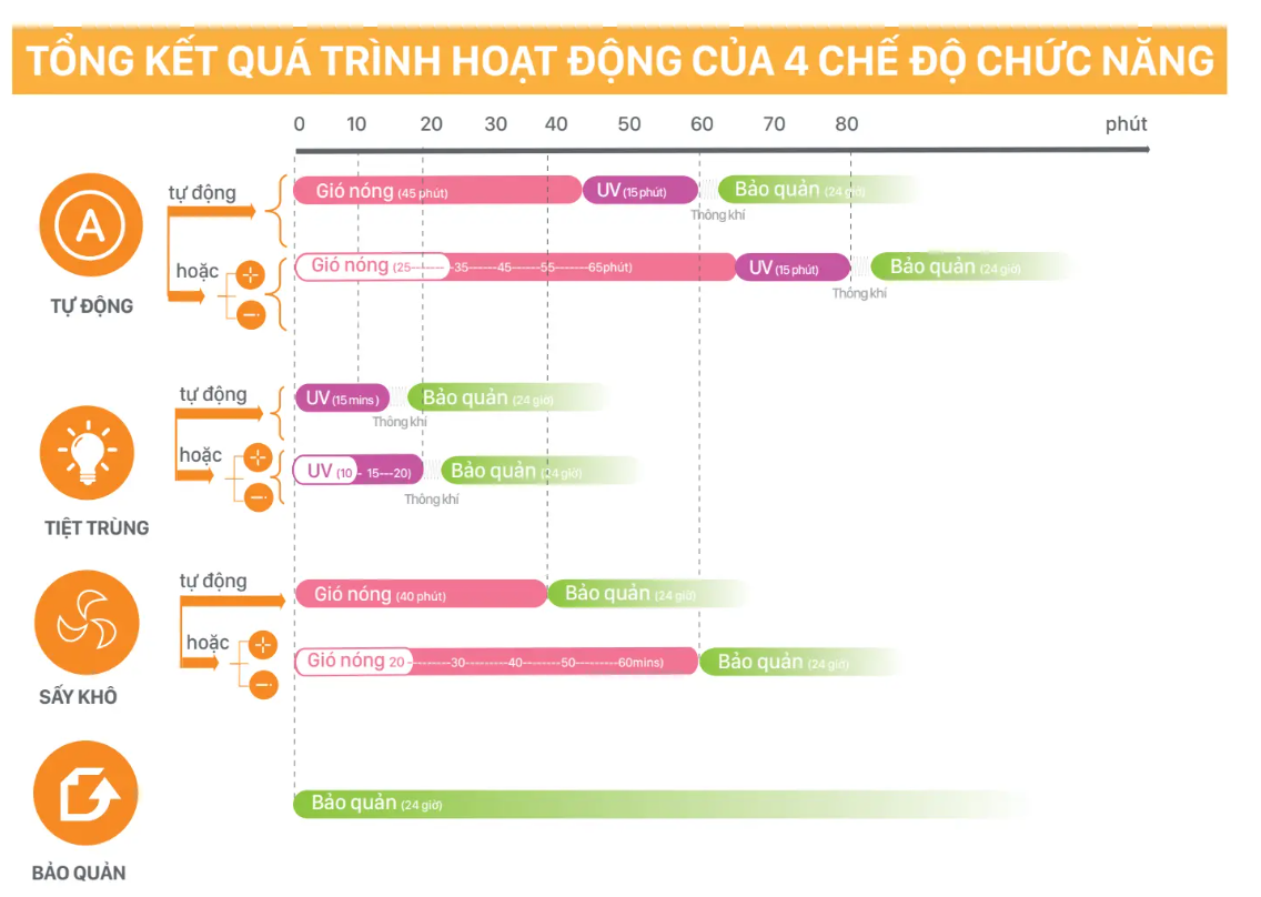 Có thể điều chỉnh thời gian làm việc của các chế độ TỰ ĐỘNG/ KHỬ TRÙNG (UVC)/ KHÔ/ BẢO QUẢN bằng cách chạm vào nút chức năng nhiều lần liên tiếp (tham khảo bảng hướng dẫn).
