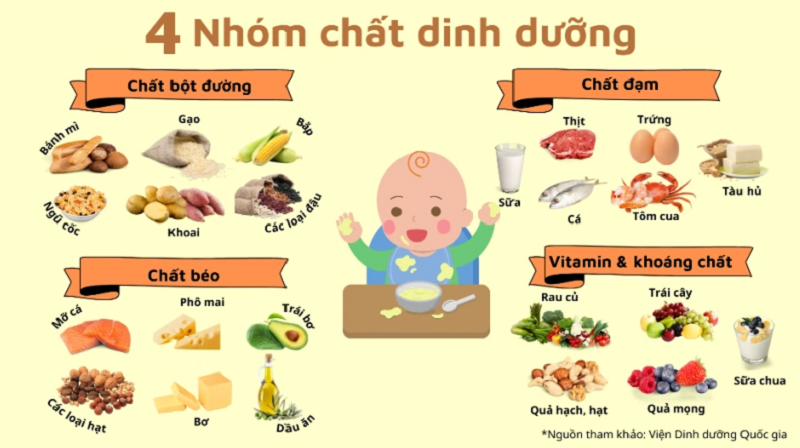 Để đảm bảo bé nhận được đầy đủ các dưỡng chất cần thiết cho sự phát triển toàn diện, mẹ nên tập trung vào 4 nhóm thực phẩm chính dưới đây: