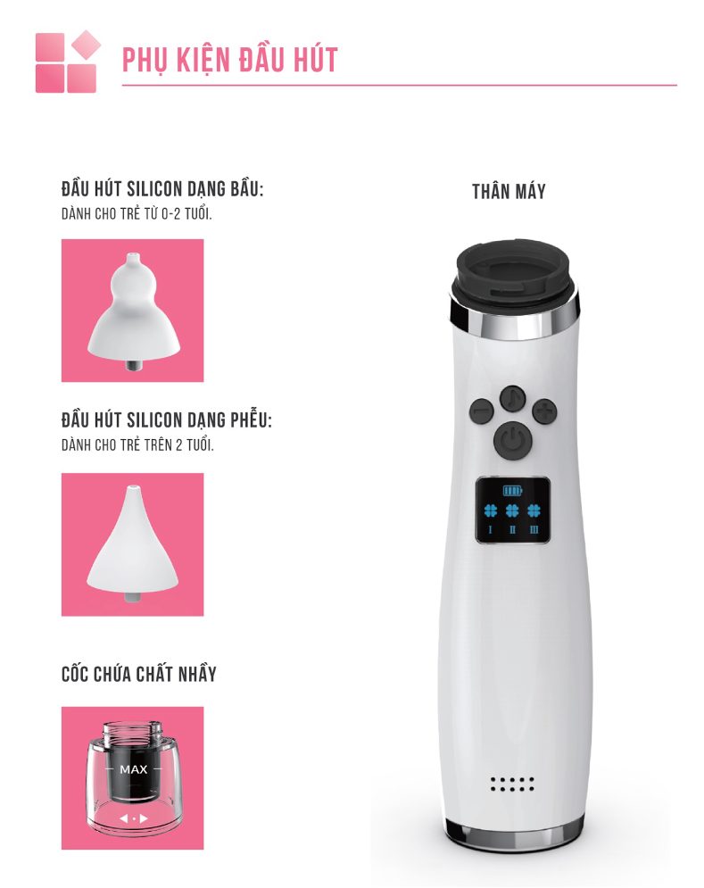 · 3 cấp độ hút, 4 đầu hút bằng silicone cùng lực hút nhẹ nhàng, giúp bảo vệ niêm mạc mũi cho bé.