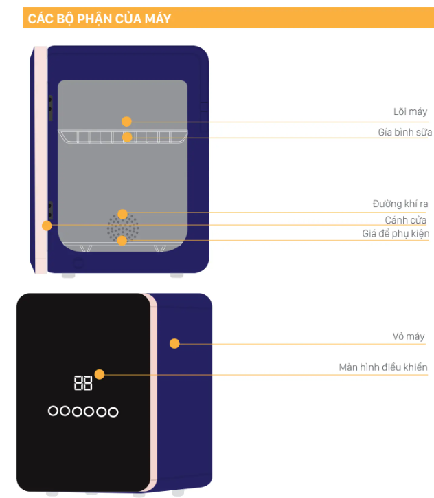 - Chức năng giữ tiệt trùng các vật dụng đã tiệt trùng lên tới 24h. Máy sẽ tự động chiếu đèn UV sau mỗi 3h hoạt động.